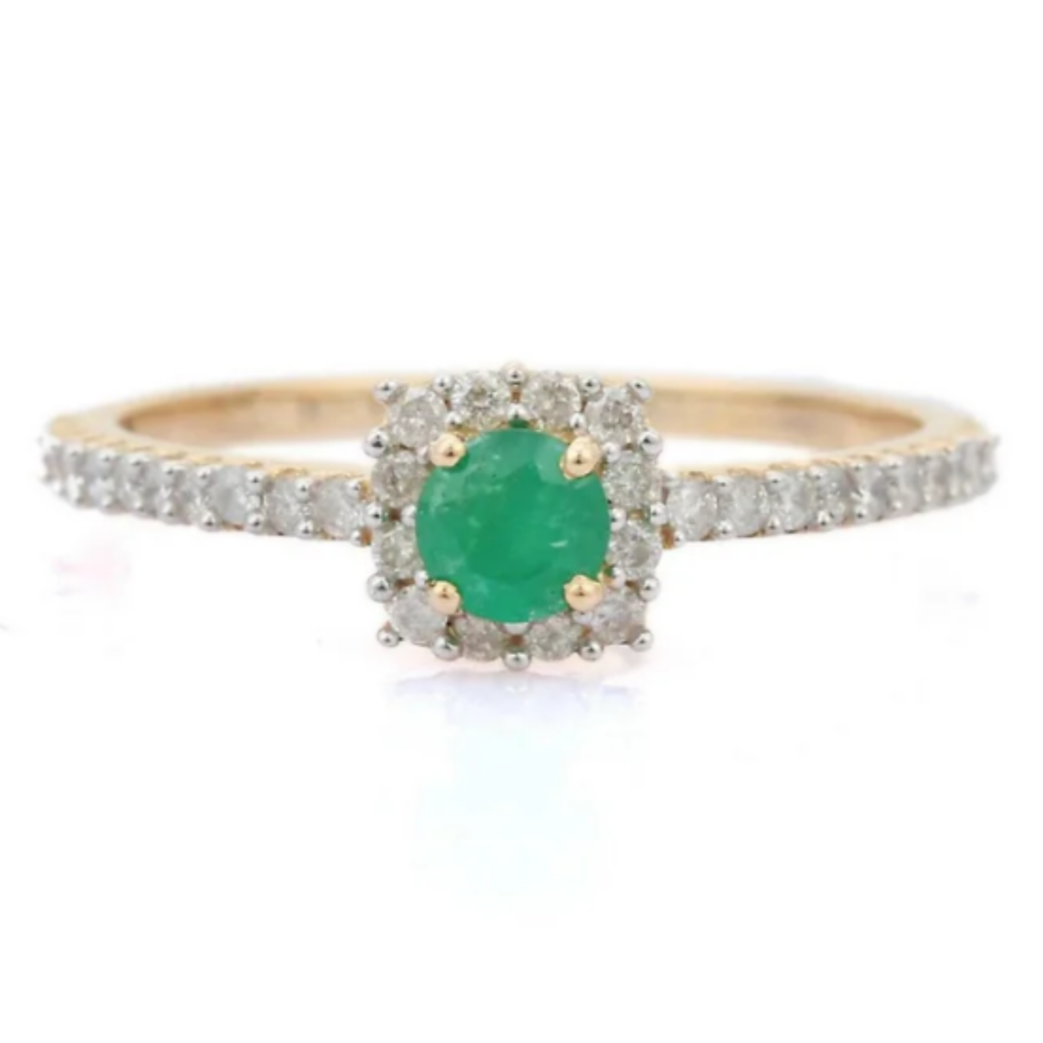 Arrived quickly and in elegant packaging. The ring sits perfectly and the diamond, emerald stones are well matched.
