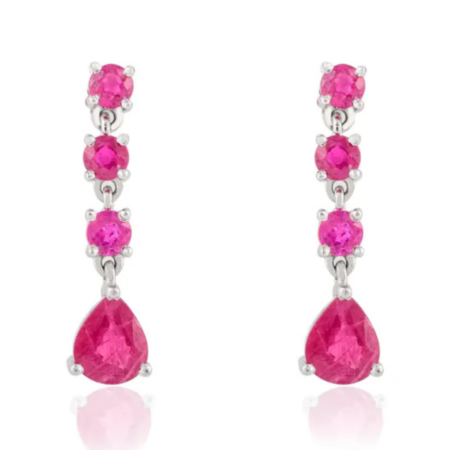 These exquisite 14K white gold dangle earrings feature vibrant round-cut ruby gemstones that radiate deep, rich red hues. The elegant design highlights the fiery brilliance of the rubies, creating a captivating and sophisticated accessory. Perfect for adding a touch of timeless elegance and glamour to any ensemble. Designed with round cut ruby in solid gold.