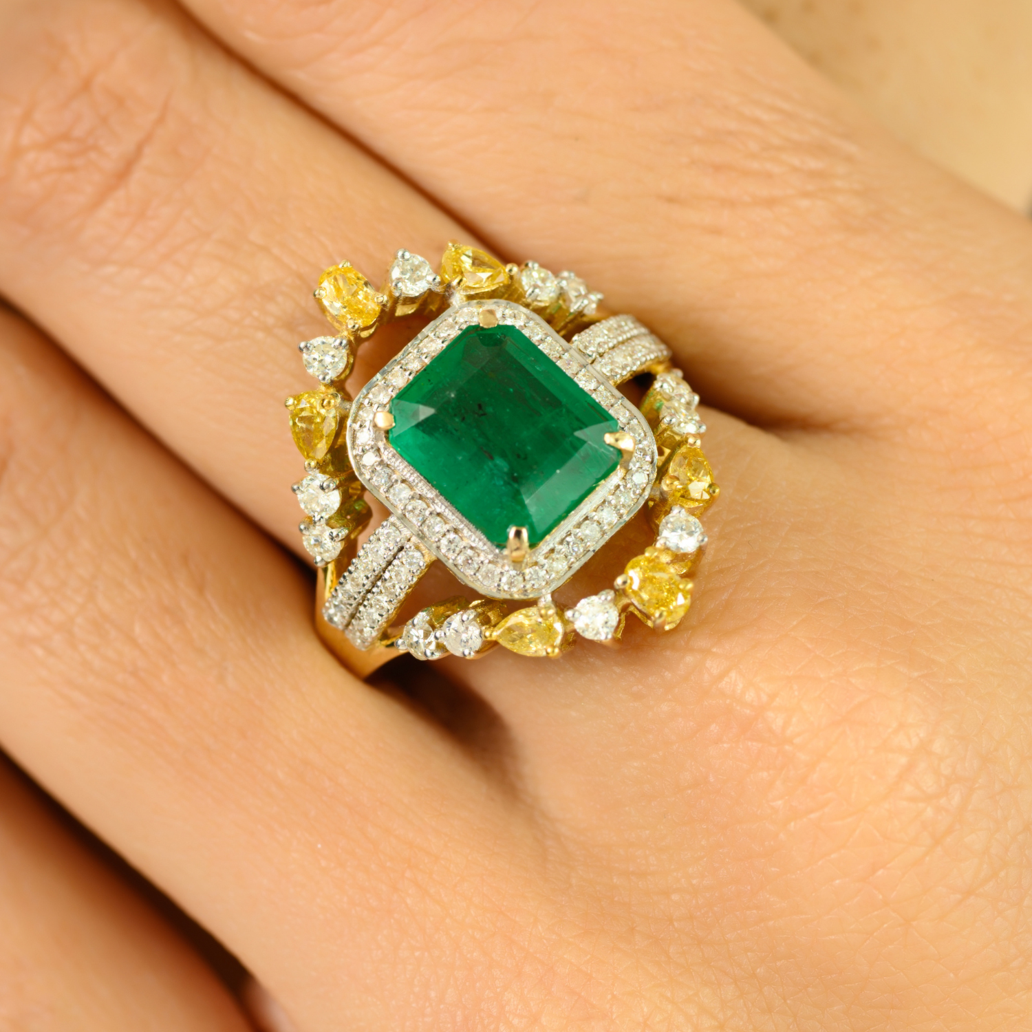 Radiating elegance and grandeur, this stunning cocktail ring is crafted in 14k yellow gold and showcases a striking 2.53 carat emerald-cut emerald at its center. Framed by a dazzling halo and intricate outer motif of 1.18 carats of brilliant round diamonds, this piece captures the essence of vintage glamour. Perfect for special occasions, this ring is designed to make a bold and sophisticated statement.