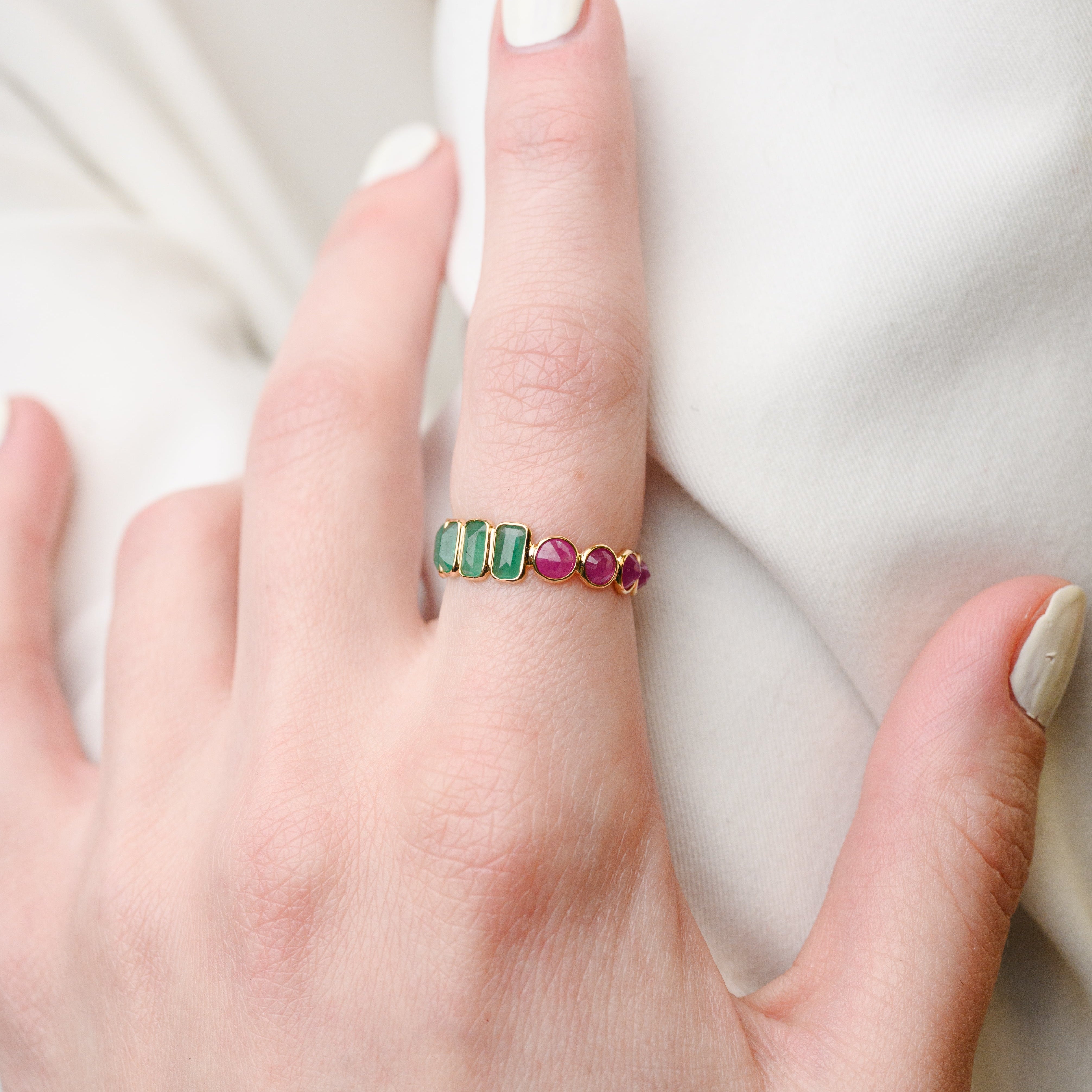 Elevate your most basic outfit with our stunning Eternity Bands. The contrasting gemstones add a unique touch and enhance the overall look. The play of multiple colors adds a very distinct yet playful touch.