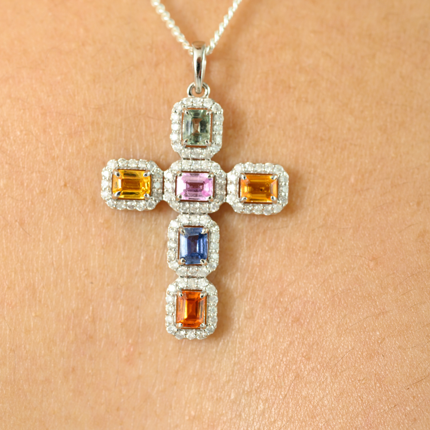 Celebrate color and spirituality with this stunning cross pendant, exquisitely crafted to captivate. Set in elegant metal, this pendant showcases a vibrant array of multi-colored gemstones with a total weight of 1.52 carats. Each emerald-cut stone is thoughtfully arranged in a striking cross silhouette and framed with a dazzling halo of diamonds, totaling 0.49 carats, for added brilliance. A meaningful yet stylish piece, this pendant effortlessly blends timeless faith with modern flair—perfect for everyday elegance or special occasions.