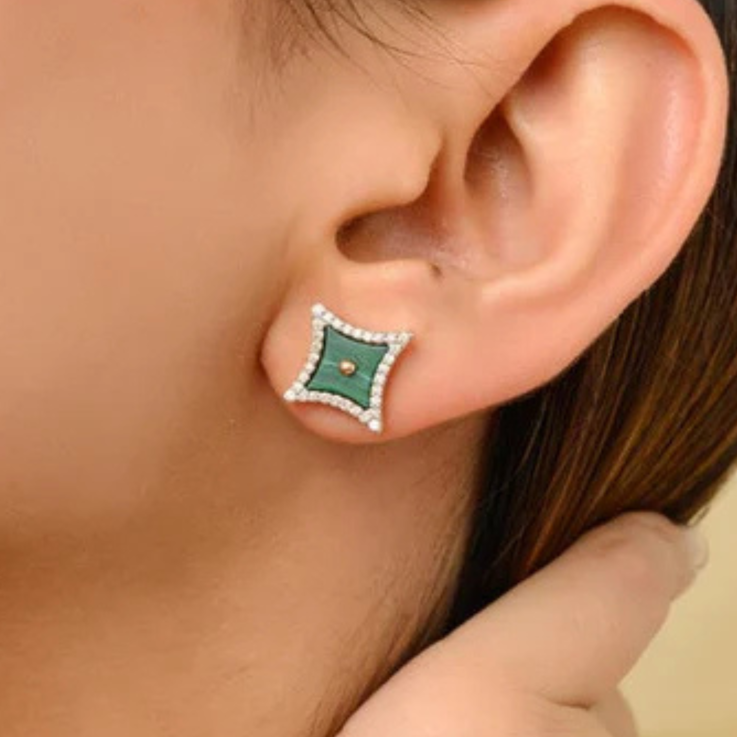 5.241 CTW Malachite Diamond Sparkle Shape Stud Earrings in 18K Gold to make a statement with your look. You shall need stud earrings to make a statement with your look. These earrings create a sparkling, luxurious look featuring fancy cut malachite and round cut diamonds.