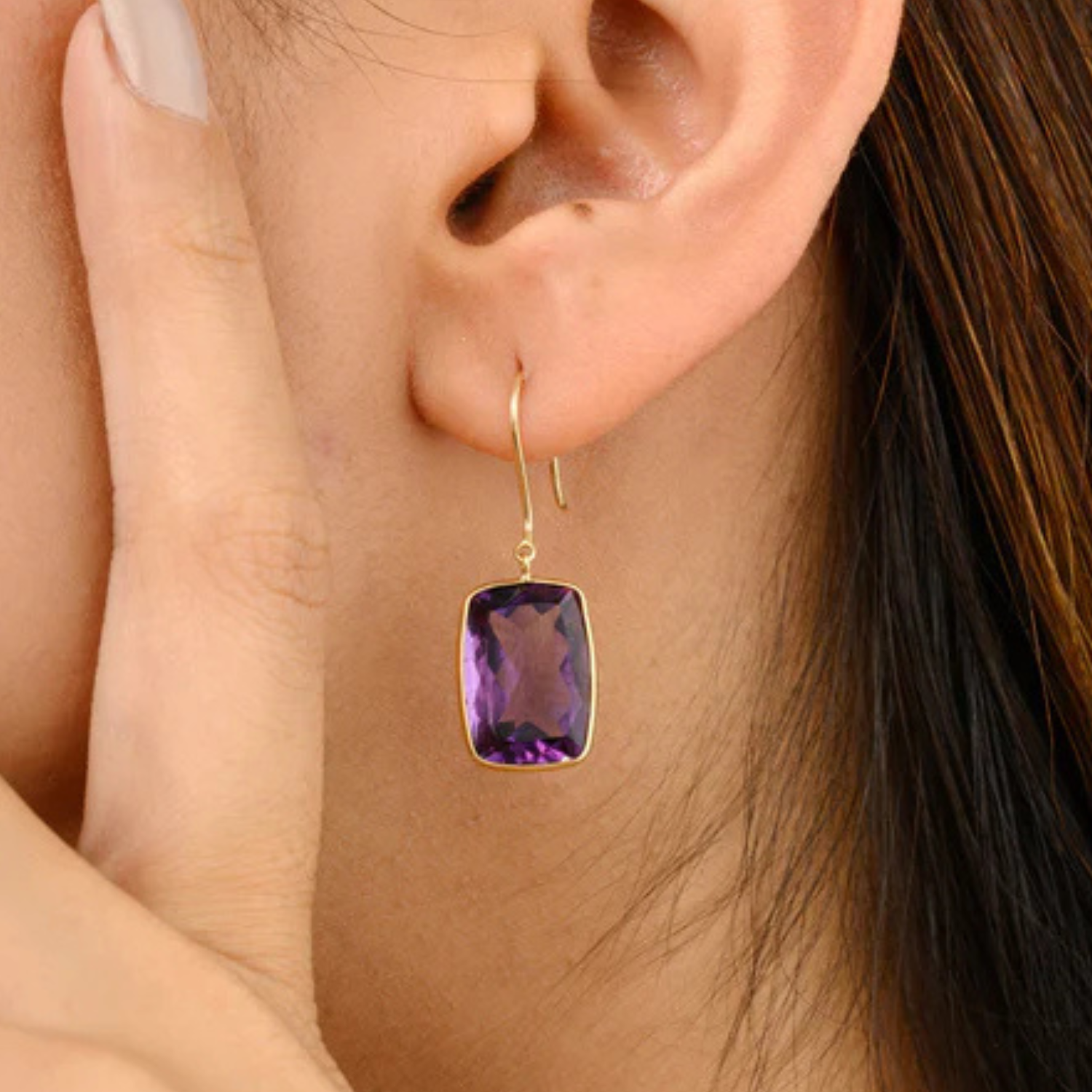 Indulge in elegance with these 18K yellow gold dangle earrings featuring captivating octagon-cut amethyst gemstones. The rich purple hue of the amethysts is complemented by the timeless allure of yellow gold, creating a stunning accessory that effortlessly elevates any look. Perfect for adding a touch of sophistication to both casual and formal attire.