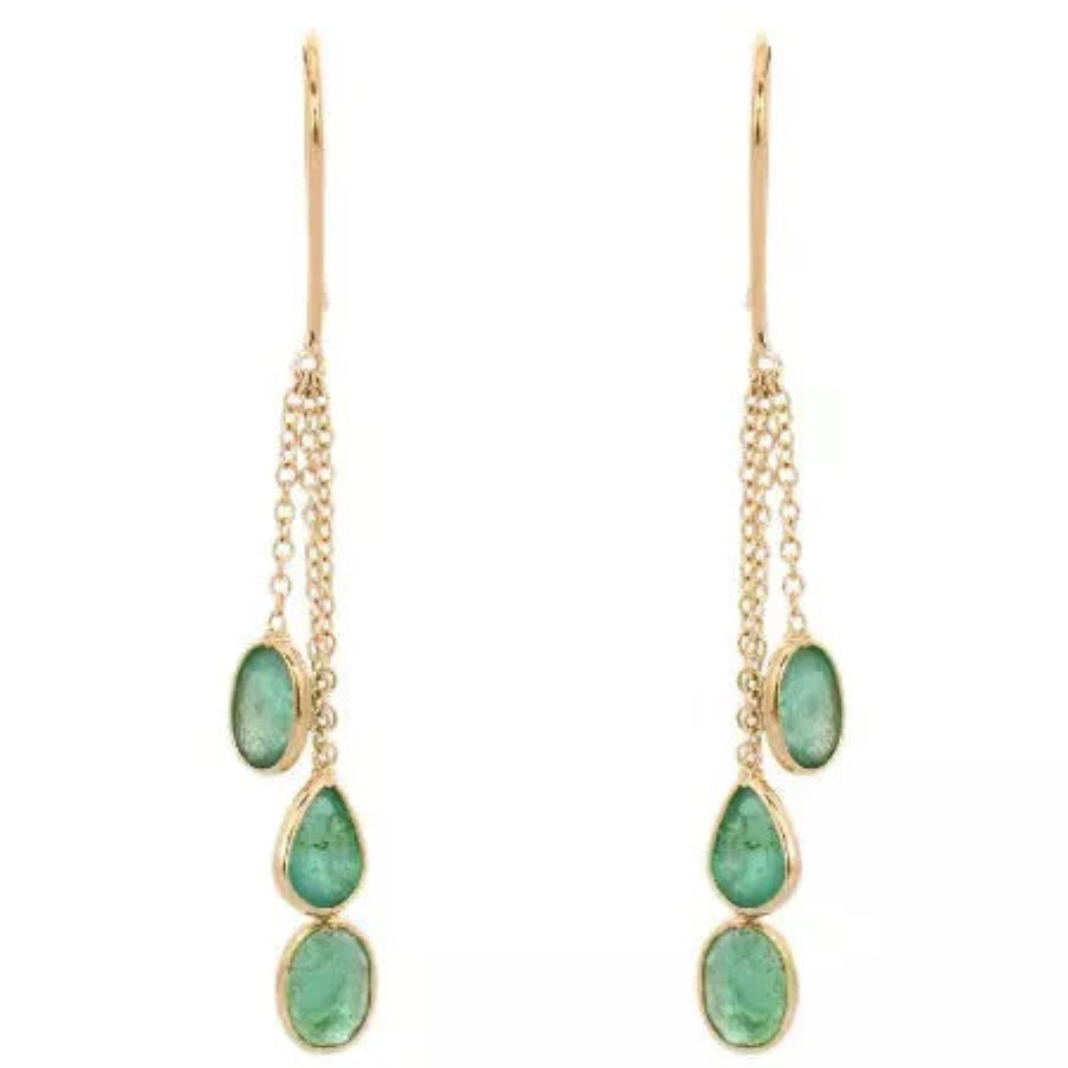 This elegant piece features a modern oval-cut emerald, bezel-set in lustrous 18k yellow gold. The emerald hangs gracefully with three delicate gold chains, adding movement and sophistication. The piece is finished with a secure ear wire lock, making it both stylish and comfortable to wear. Perfect for any occasion.