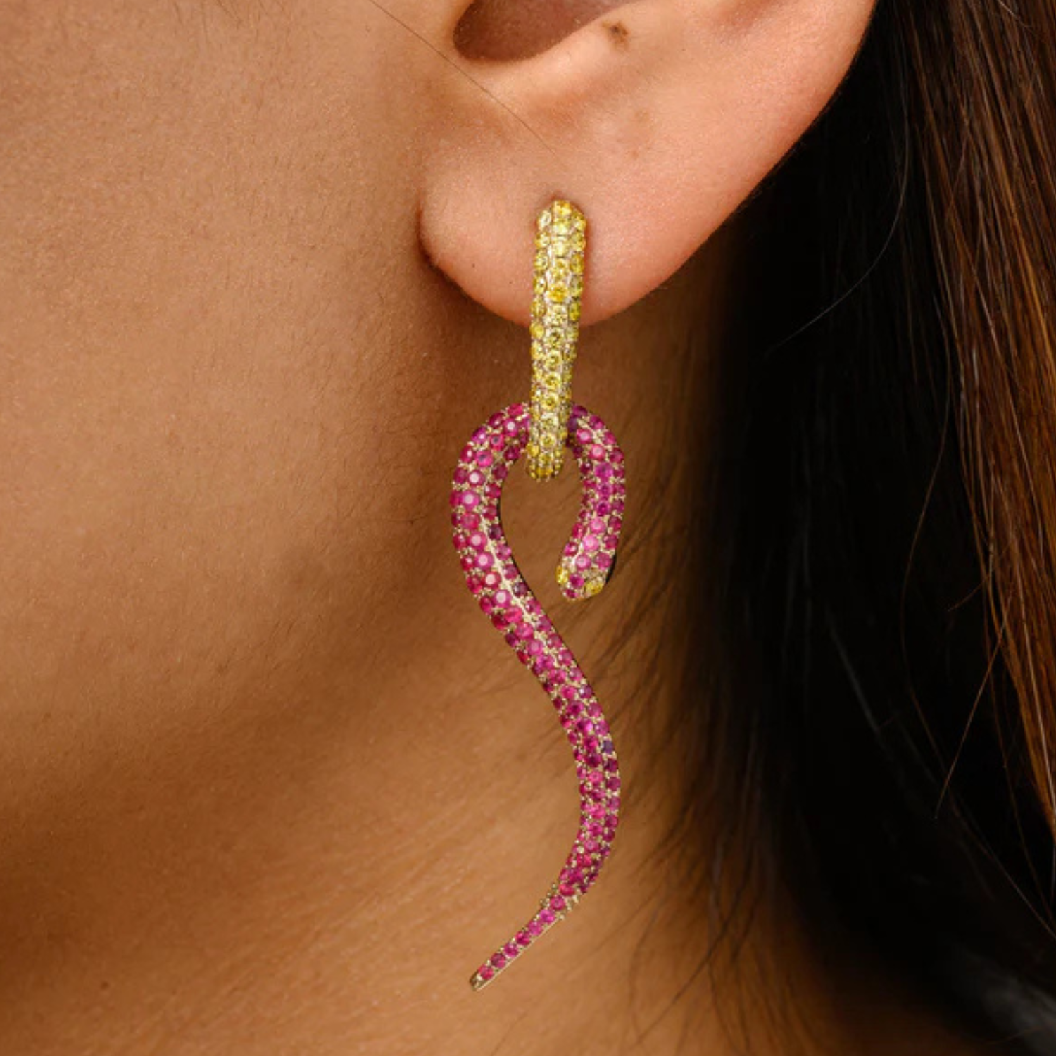 2.42 CTW Yellow Diamond and Ruby Snake Dangle Earrings in 18K Gold to make a statement with your look. You shall need dangle earrings to make a statement with your look. These earrings create a sparkling, luxurious look featuring round cut diamonds .