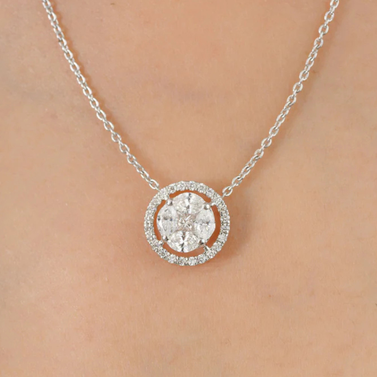 Brilliant Diamond Halo Pendant Minimalist Necklace in 18K Gold studded in gold. This stunning piece of jewelry instantly elevates a casual look or dressy outfit.