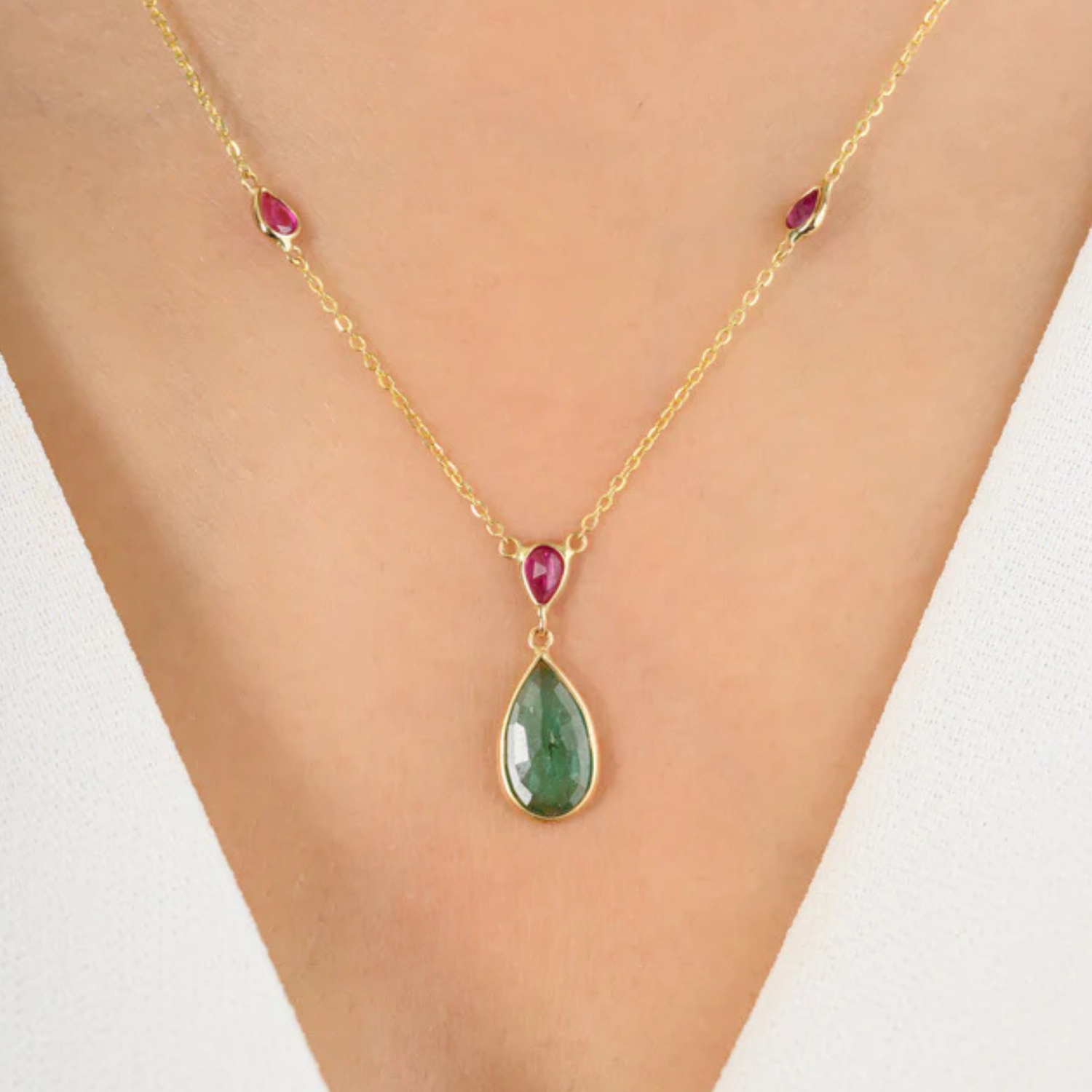 This stunning necklace features a modern teardrop-shaped emerald and a pear-cut ruby, both elegantly suspended from a delicate chain. The vibrant green and deep red gemstones create a striking contrast, making it a perfect statement piece for any occasion. The sleek design exudes contemporary sophistication and timeless beauty.