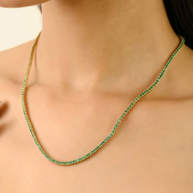 This stunning tennis necklace showcases round-cut natural emeralds totaling 6.82 carats, beautifully set in luxurious 14K yellow gold. Each emerald, approximately 2 mm in diameter, is securely held by four-prong settings. The necklace measures approximately 17 inches in length, with a width of about 0.08 inches and a depth of 0.1 mm. It weighs around 14.54 grams in total. For added security, the necklace features a box clasp with double safety locks, ensuring comfortable and safe wear.