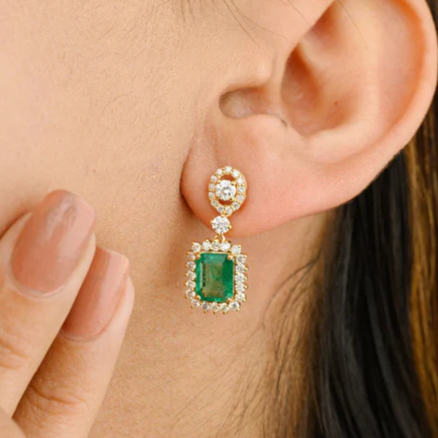 Designed with an octagon-cut emerald and a diamond halo stud in pure gold.